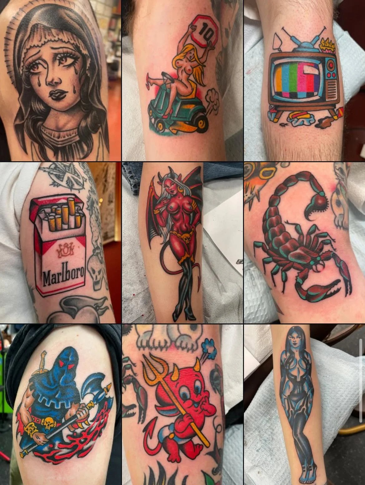 Natasha Bertram specializes in monkey, daisy, spider, pinup, clown, lady head, reaper, Kim Kardashian, John Carpenter, casket, bleeding heart, crustacean, scorpion, Seinfeld, boobs, hotdog, rose, parrot, butterfly tattoos. A Gemini. In Chicago. In Humboldt Park.